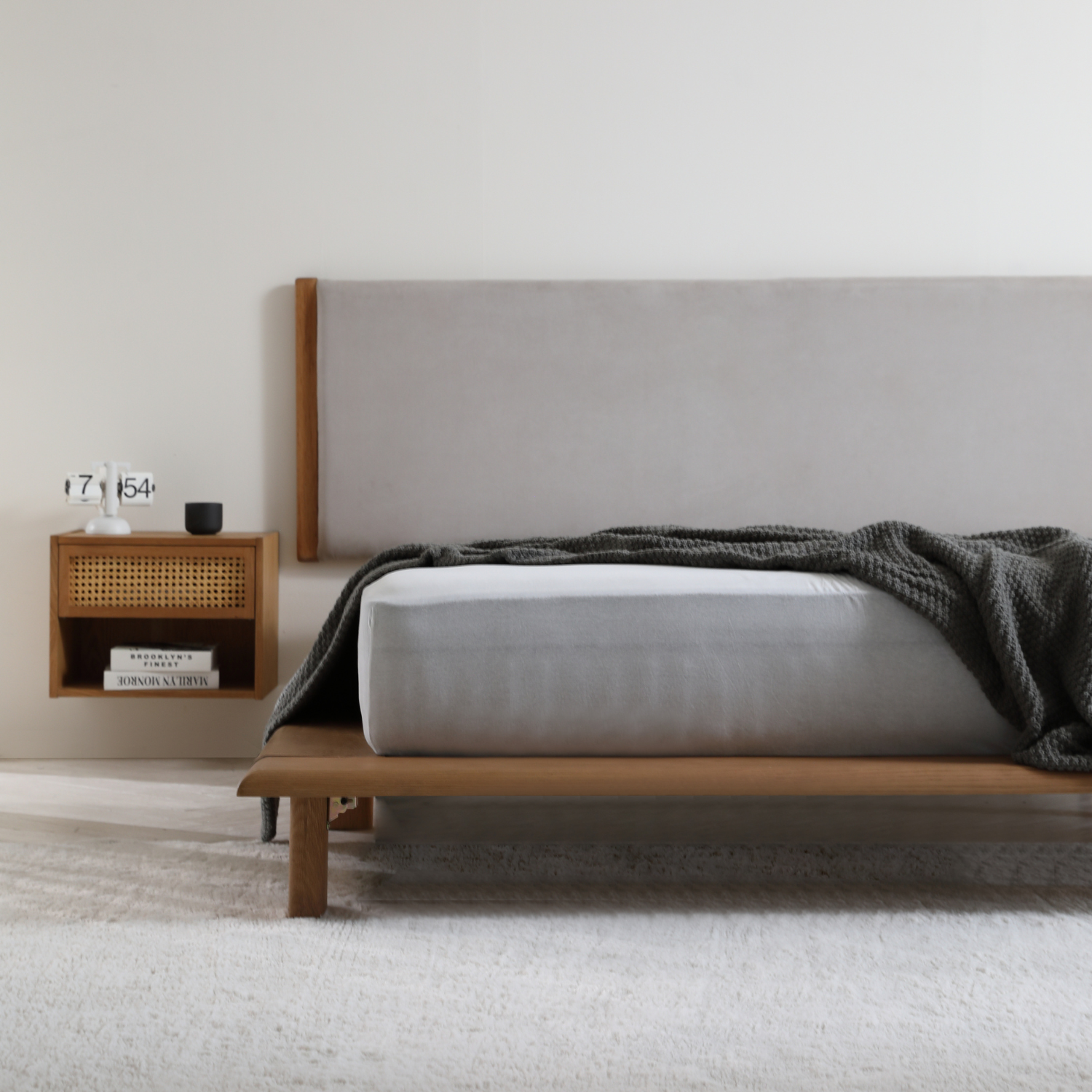 The Kahala Bed's low profile frame and proximity to the floor offers a calming, grounding effect, reminiscent of the Japanese 'shinrinyoku' or forest bathing, where being closer to the ground brings peace. The Kahala Bed offers a similar grounding experience in your bedroom.