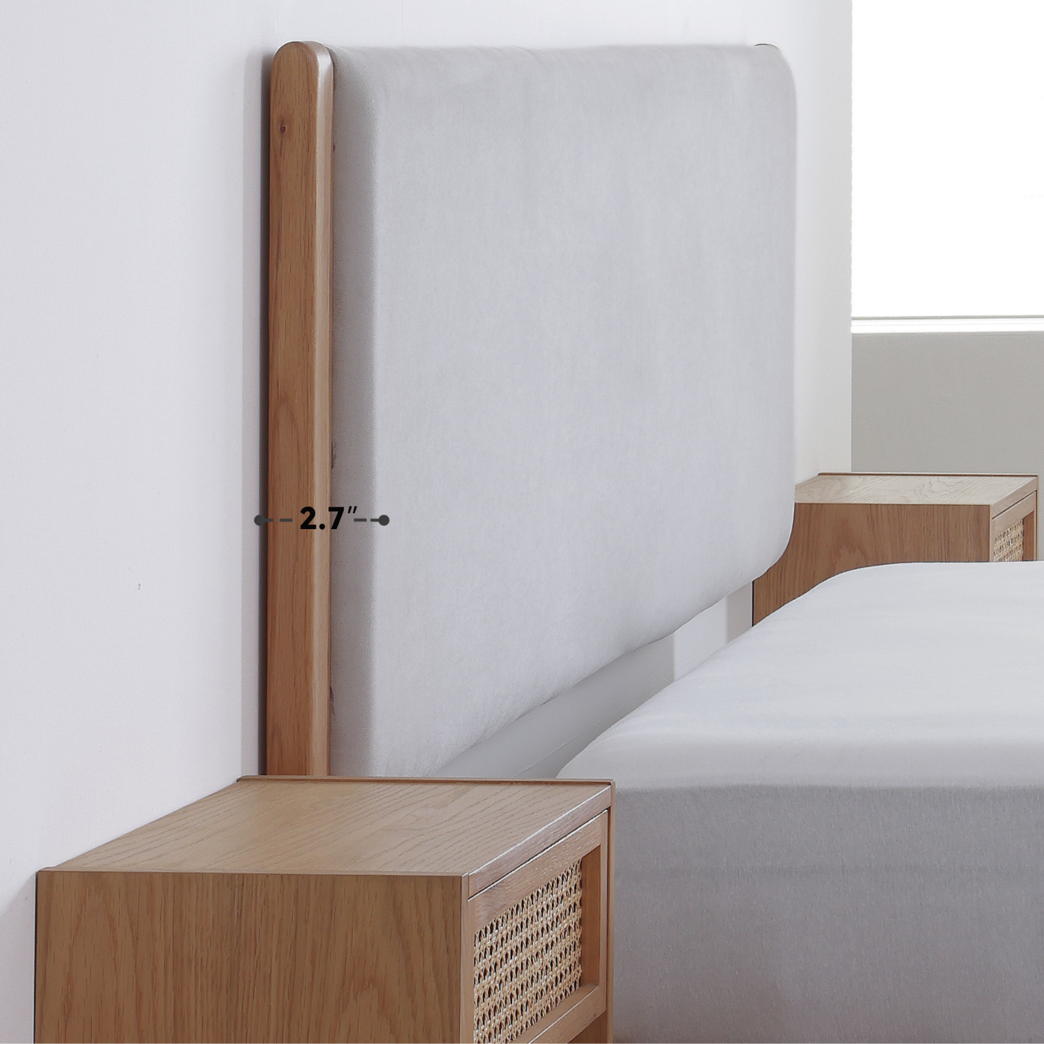 The Kahala Bed's wall-mounted headboard is designed for space optimization, affording extra room and maintaining a neat aesthetic. It's unique pillow-board headboard, mountable on the wall, offers the flexibility to adjust its height according to personal preference or ergonomic need, encapsulating the essence of mindfulness in design.