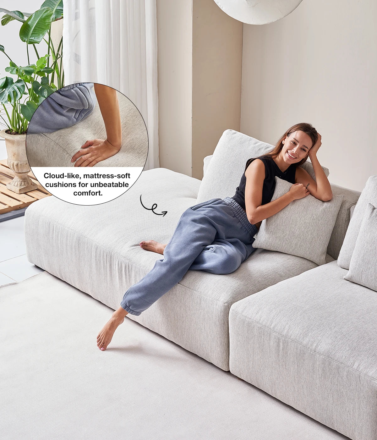 Denser and more supportive than standard foams, it adds a layer that has a soft, plush feel, enhancing the overall comfort of the sofa.